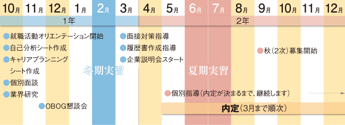 計画的な年間スケジュールを組み、ガイダンスや特別セミナー、親身な個人相談など、就職に対しての徹底したサポート体制を整えております。