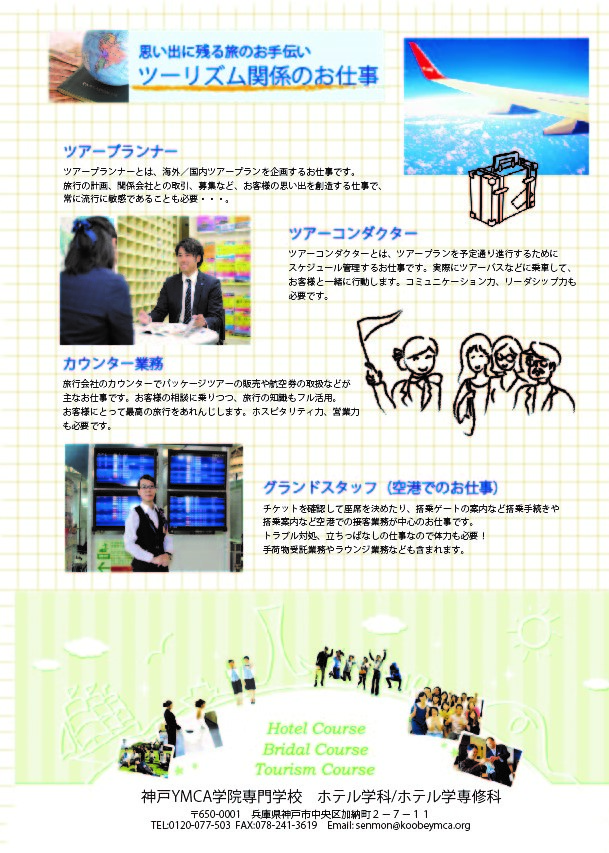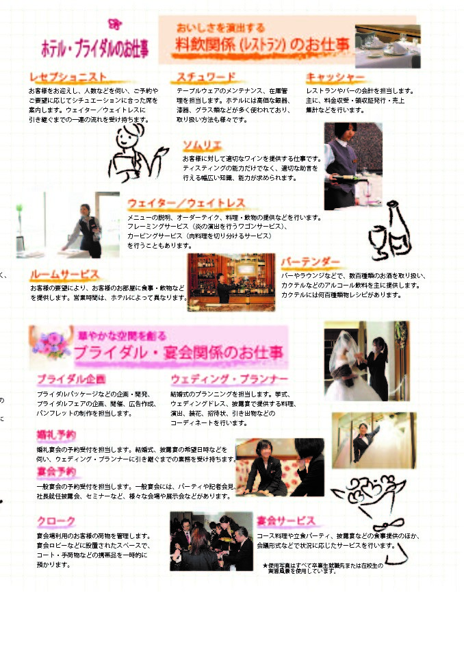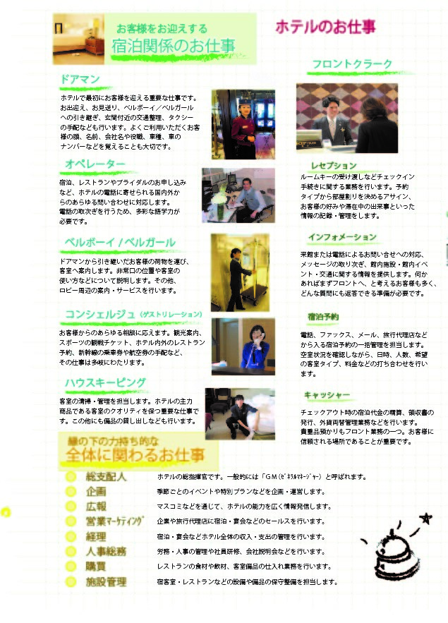 ホテルマン、ウェディングプランナー、観光ガイドや空港スタッフなど